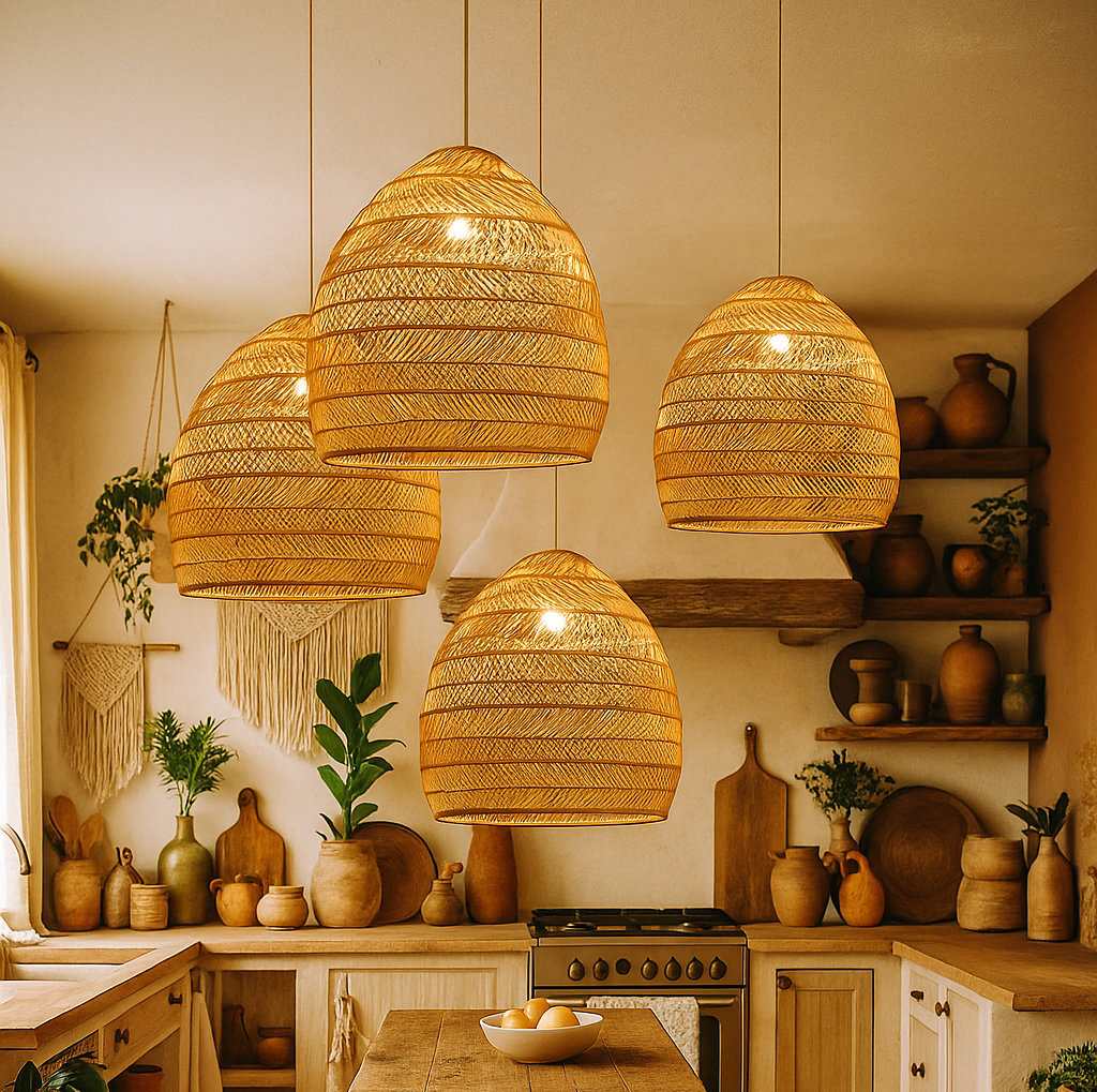 Boho-inspired rattan weave adds natural texture and warmth